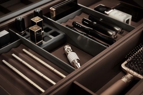 妆容与饰品的巧妙点缀,往往能成为穿搭的点睛之笔。常规的穿搭过程往往需要在衣柜、梳妆台甚至卫浴间之间来回穿梭,每一身无可挑剔的装扮背后都是一场费时费力的战争。悍高BV2.0系列衣柜五金基于对实际穿搭场景的深刻洞察、重组衣柜功能,创新性将梳妆台的美妆与饰品收纳功能纳入其中,使得整个穿搭动线得以精简至一柜之内,让穿搭体验的仪式感和氛围感达到Max值。平放竖放相结合的精妙布局设计打造出错落有致、稳而易于取放的专属美妆隔间,面霜、口红、化妆刷等彩妆、护肤物件都能在悍高BV2.0系列美妆收纳篮中“安身立命”,让妆容与穿搭的配合更默契无间。而饰品收纳篮的收纳巧思同样精密细腻,金属线条细致地划分每一寸空间,为手镯、胸针等饰品提供独立栖地;而对于戒指、耳环等容易滚动或丢失的小巧饰品,悍高BV2.0系列饰品收纳篮内设有独立卡槽区,能精准卡紧放置,让每一款饰品都倍显矜贵;提拉式防尘盖收纳专区能为贵重饰品提供更悉心守护。推拉之间,璀璨映入眼帘,让穿搭配件的挑选成为一种灵魂碰撞。
