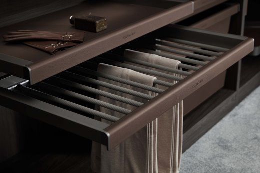 穿搭的仪式感来自于丝滑从容的收纳取放,也来自于悍高BV2.0系列衣柜五金的不凡细节。铝合金材质作为框架的坚实选择,不仅为悍高BV2.0系列衣柜五金奠定了摩登轻奢气质,更能在面对大批量的厚重衣物亦能稳若泰山,无惧承重与变形;皮质元素的贯彻与精湛缝线工艺的融合,一破传统五金的高冷印象,高定质感彰显无疑,且触手可及之处皆温润动人。完美贴合人体工程学的L型拉手设计,在三节全拉出静音导轨的加持下,顺滑无声,更显雅致。