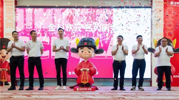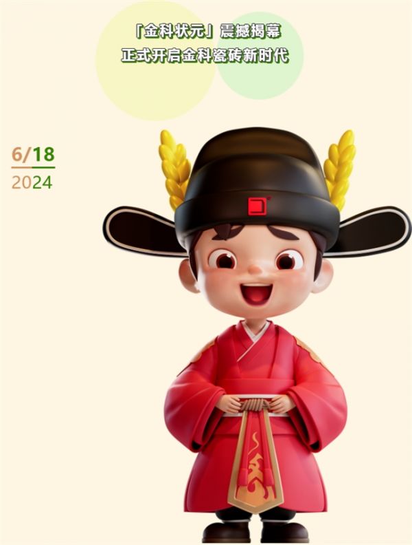 2024年6月18日,金科品牌公司高层领导齐聚一堂,共同为新IP「金科状元」揭幕。随着幕布缓缓揭开,「金科状元」这一充满活力和创新精神的卡通形象跃然眼前。它身穿采用粤绣而成的状元袍、头戴寓意“大卖”的稻棵冠翅造型的冠帽,既体现了金科瓷砖紧跟时代潮流的创新精神,也象征着品牌对于传统文化的尊重与传承。