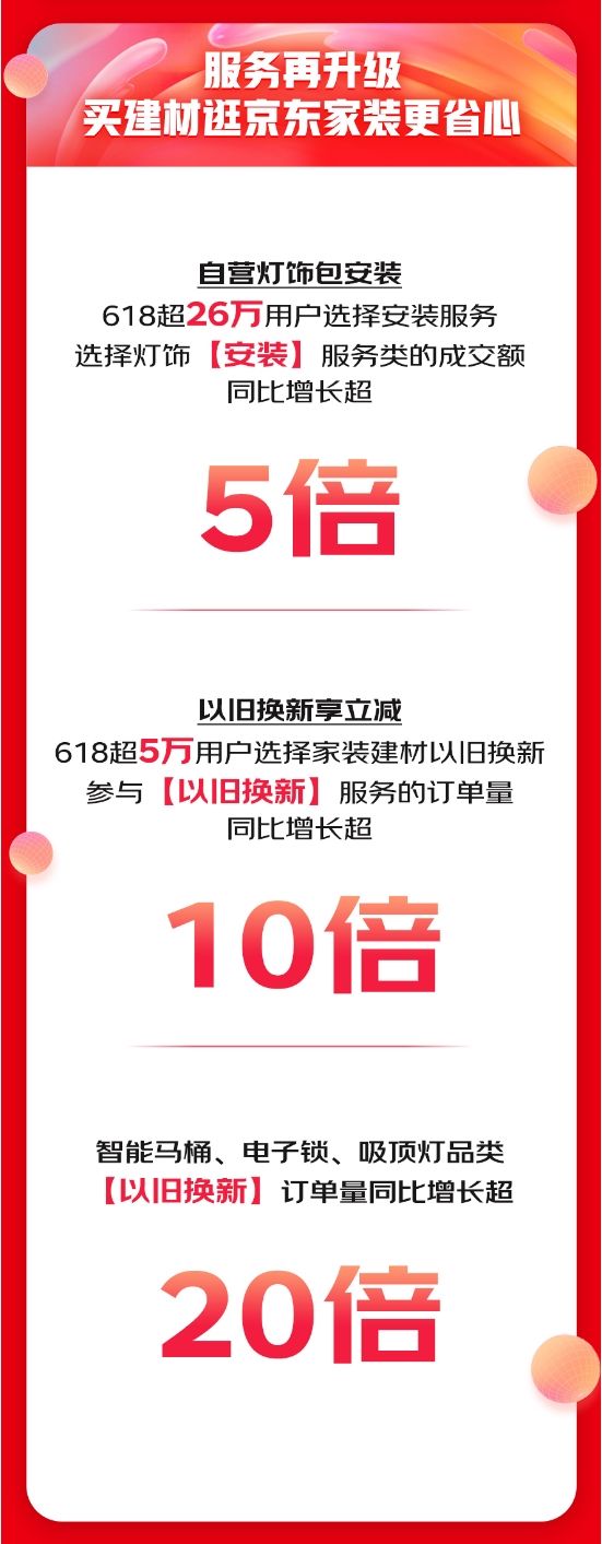 京东618期间,超26万用户下单自营灯饰并完成签收预约,选择灯饰安装服务类的成交额同比增长超5倍;超5万用户选择家装建材以旧换新,享受立减优惠,参与以旧换新服务的订单量同比增长超10倍;智能马桶、电子锁、吸顶灯品类以旧换新订单量同比增长超20倍。