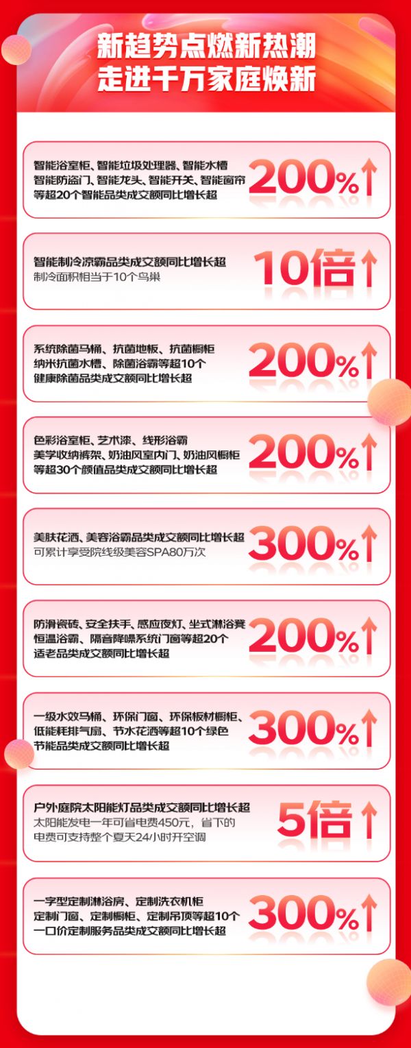 人们对美的追求,已渗透至日常生活的方方面面,京东618期间,色彩浴室柜、艺术漆、线形浴霸、美学收纳裤架、奶油风室内门、奶油风橱柜等超30个颜值品类成交额同比增长超200%;美肤花洒、美容浴霸品类成交额同比增长超300%,可享受院线级美容spa80万次。人性化的适老产品,以及能够精准满足个性化需求的定制产品,同步进入了更多家庭,京东618期间,防滑瓷砖、安全扶手、感应夜灯、坐式淋浴凳、恒温浴霸、隔音降噪系统门窗等超20个适老品类成交额同比增长超200%;一字型定制淋浴房、定制洗衣机柜、定制门窗、定制橱柜、定制吊顶等超10个一口价定制服务品类,成交额同比增长超300%。