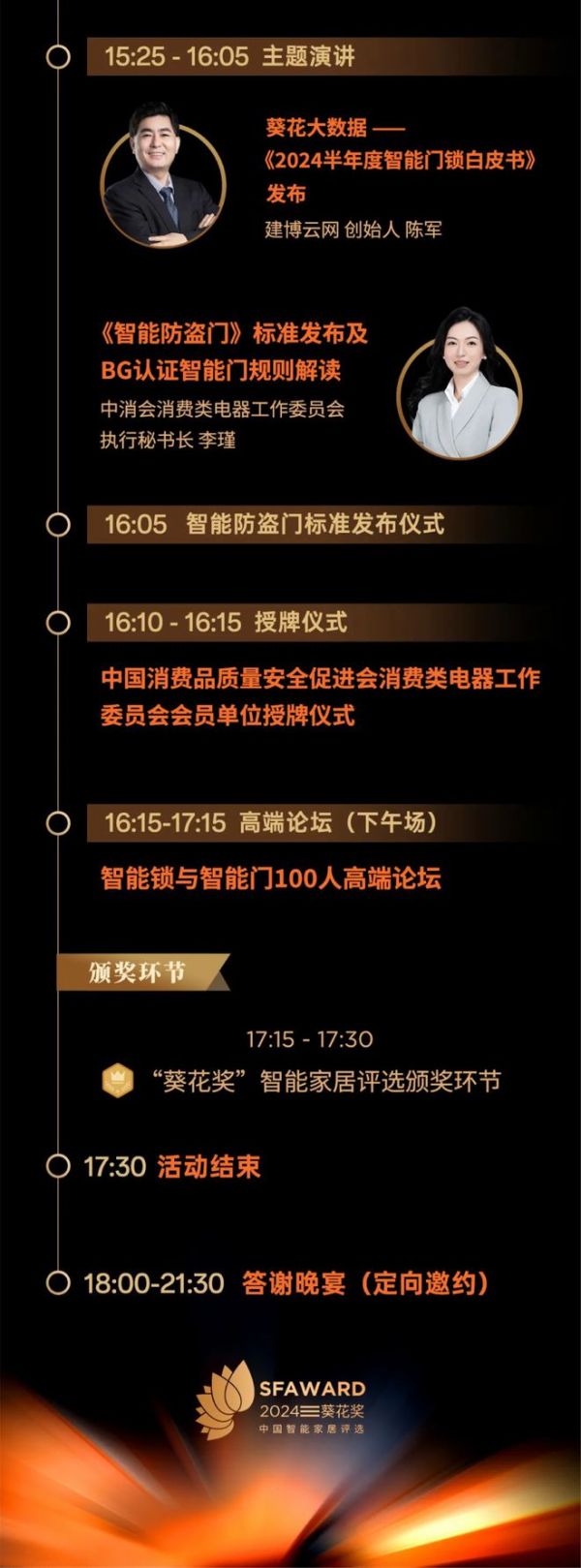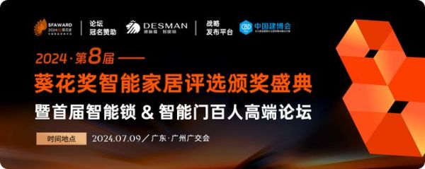 荣耀八载,再绽新辉;强者对决,势不可挡。2024第八届“葵花奖”智能家居评选颁奖盛典暨首届智能锁&智能门百人高端论坛将于7月9日在中国建博会(广州)期间广交会展馆A区B层隆重举行。作为智能家居行业的盛会,本次盛典将汇聚众多业内精英和领军企业,共同探讨智能家居行业的未来发展方向,分享业内最新技术和创新应用。