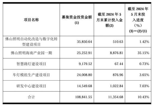 截止2024年5月31日,佛山照明募集资金投资项目实际投资情况如下(单位万元):