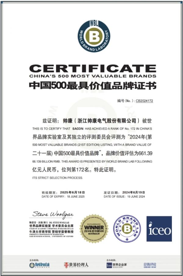2024年6月19日 ,由世界品牌实验室和世界经理人联合主办的2024 年(第二十一届)世界品牌大会暨2024年(第二十一届)中国500最具价值品牌发布会在北京盛大举行,会上发布了2024年度(第21届)“中国 500 最具价值品牌”榜单。作为中国i第一代厨电头部品牌,帅康连续17年强势入选榜单,在专业厨电品牌中位居前列,品牌领跑地位得到行业内外的广泛认可。