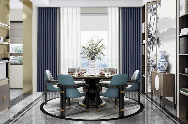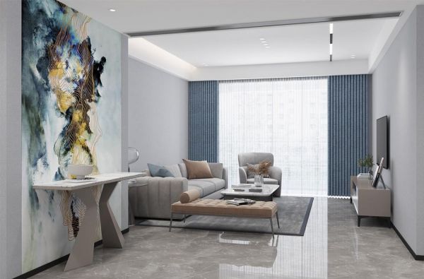 高级的蓝灰色墙布呈现低调内敛的气质,蕴含雅致格调,搭配具有东方雅韵的山水印象壁画,赋予居室宏大的视野和律动节奏,让屋主尽享沉稳、舒适、优雅的都市生活。