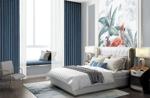 蓝灰墙布与靛蓝窗帘搭配,完美融合灰色的高雅和蓝色的沉静,红色的火烈鸟壁画,寓意幸运和华贵灵,整体流畅优美,时尚优雅,让居者拥抱自然、本真的绿意生活。