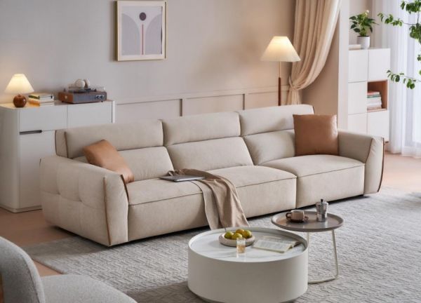布墩墩沙发外观宽厚,形态饱满,慵懒感十足。双色双面料可选,香草奶黄猫抓绒布,淡雅柔和,顺滑细腻,猫咪不爱抓;坚果栗咖高分子舒感布,醇厚温馨,柔韧亲肤,自带高级皮纹质感,一款沙发,两种氛围。座包、靠背、扶手,不同部位根据人体倚靠重量,选用不同软硬度和密度海绵填充,科学配比,柔弹与支撑性兼具。二八法则双分区靠背,20%头颈支撑区,紧致饱满,厚实贴合颈部;80%腰背承托区,挺腰护脊,深度缓解腰肌劳损。38cm一体加厚矮座包,坐感软硬适中,打造窝起来的安全感,舒享夏日时光。