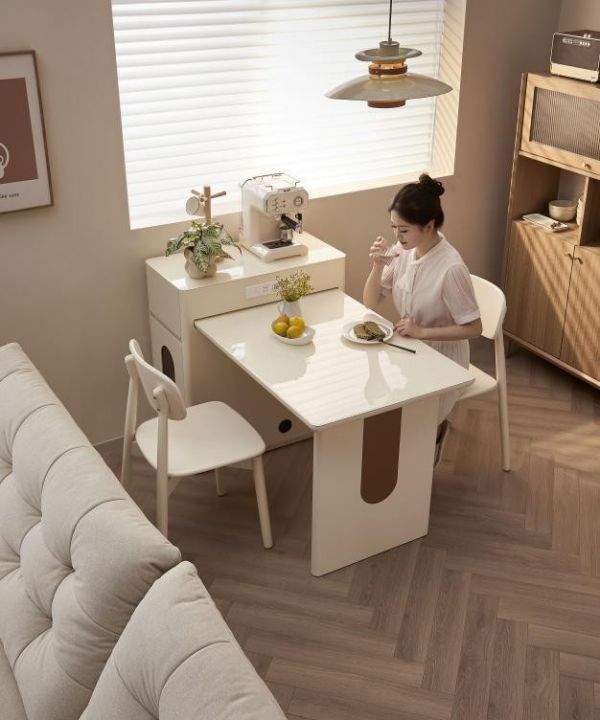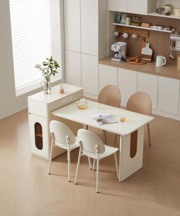 轻复古可伸缩岛台餐桌,慕斯白辅以茶色玻璃,简洁中又不失俏皮,打造轻松用餐氛围。桌面94cm-125cm自由伸缩,满足2-6人用餐,日常或聚会都能轻松hold住,小户型也友好。岛台餐桌一体设计,增加厨艺施展空间,多人备餐不拥挤。大容量双层底柜,可盛放各种小家电、锅具,玻璃柜门可视化储物,双侧开门取放更便利。自带大功率插座,不被电量所扰,追剧下饭更安心,火锅、烤肉也能随时吃。