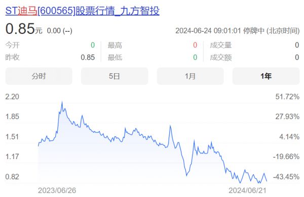 今日(6月24日),迪马股份(ST迪马:SH600565,股价0.85元,市值21.18亿元)于开市起正式停牌。据此前公告,迪马股份股票连续20个交易日的每日股票收盘价均低于1元,已触及交易类退市指标,上海证券交易所已于6月21日下发了拟终止公司股票上市的事先告知书。