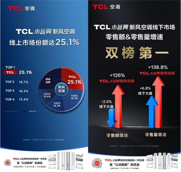 随着TCL空调武汉智能制造基地的全面投产,TCL空调的产能也迅速攀升,2023年TCL 空调年产量突破1600万套。据悉,TCL空调的产品已销往160余个国家及地区,产销量跻身行业前四,出口位居行业前三,这无疑为TCL空调的全球竞争打下坚实基础。据中怡康2024年W1-W20线上年累销量数据显示,TCL新风空调以25.1%的份额稳居榜首。今年W1-W22线下年累计销售数据,TCL新风空调线下市场零售额、零售量增速双榜第一,均跑赢大盘,增长势头迅猛。