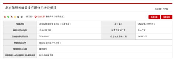 记者留意到,据北京产权交易所信息,6月5日,北京保顺善筑置业有限公司发布增资项目信息,拟募集资金金额显示为“择优确定”。而北京保顺善筑置业有限公司,即颐璟和煦的开发商。