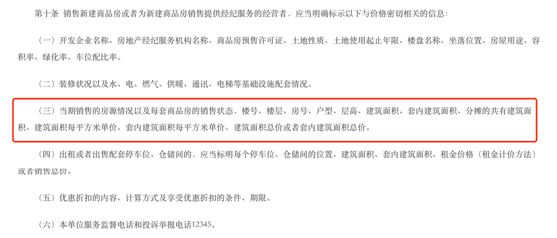 去年12月,北京市市场监督管理局发布的《北京市商品房销售明码标价规定》指出,应当明确标示“当期销售的房源情况以及每套商品房的销售状态、楼号、楼层、房号、户型、层高、建筑面积、套内建筑面积、分摊的共有建筑面积、建筑面积每平方米单价、套内建筑面积每平方米单价、建筑面积总价或者套内建筑面积总价”。