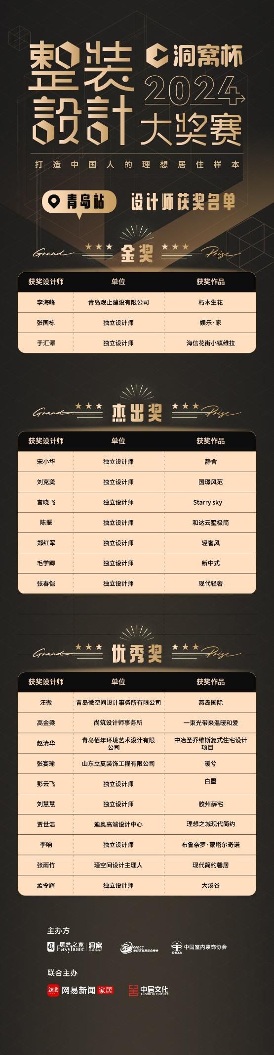 经过数月的激烈角逐以及大众评审的热情参与后,复赛评审团专家们,从空间合理性、功能实用性、设计创新性、环保性、美学性五大维度进行精准评分筛选,按照作品的总评分排序晋级,经大赛组委会审核通过后,最终公布各个城市站获奖名单。至此,2024洞窝杯整装设计大奖赛-青岛站奖名单也正式出炉! (排名不分先后)