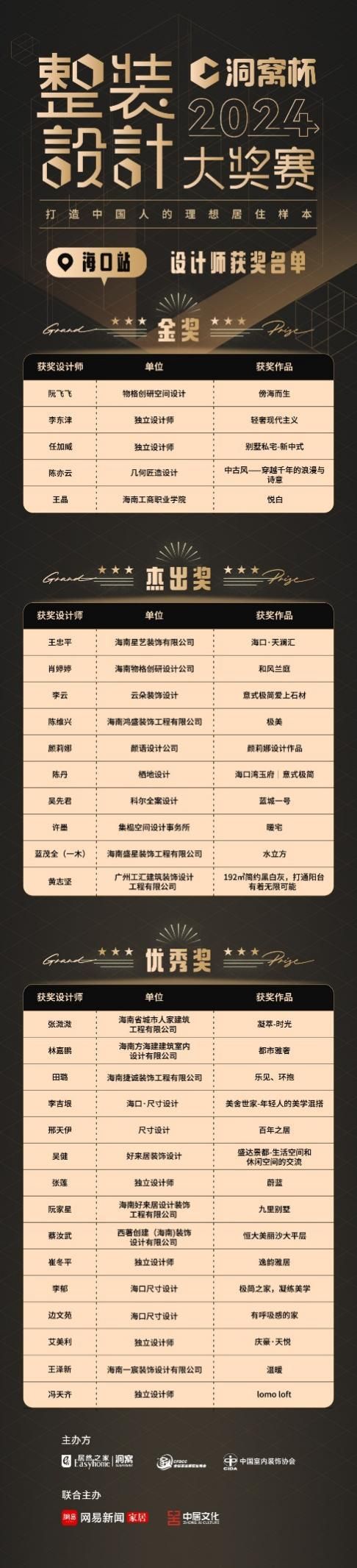 经过数月的激烈角逐以及大众评审的热情参与后,复赛评审团专家们,从空间合理性、功能实用性、设计创新性、环保性、美学性五大维度进行精准评分筛选,按照作品的总评分排序晋级,经大赛组委会审核通过后,最终公布各个城市站获奖名单。至此,2024洞窝杯整装设计大奖赛-海口站奖名单也正式出炉! (排名不分先后)
