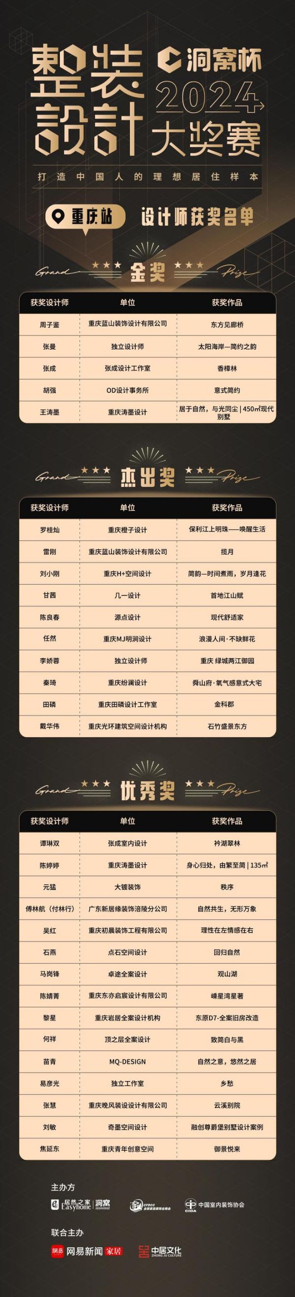 经过数月的激烈角逐以及大众评审的热情参与后,复赛评审团专家们,从空间合理性、功能实用性、设计创新性、环保性、美学性五大维度进行精准评分筛选,按照作品的总评分排序晋级,经大赛组委会审核通过后,最终公布各个城市站获奖名单。至此,2024洞窝杯整装设计大奖赛-重庆站获奖名单也正式出炉! (排名不分先后)