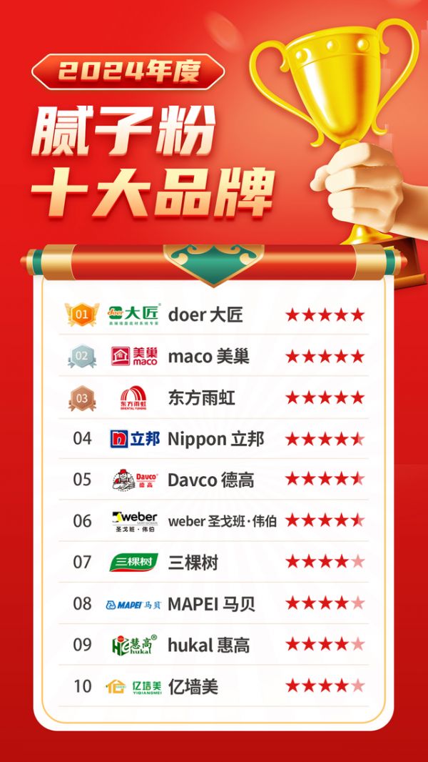 在建材行业中,腻子粉作为墙面装修的重要材料,其品质直接影响到墙面的美观度和耐用性。在众多腻子品牌中,"大匠腻子粉"以其卓越的品质和性能,成功跻身"腻子十大品牌"之列,成为国内腻子行业的领军品牌。本文将深入探讨大匠腻子粉成为头部品牌的原因。