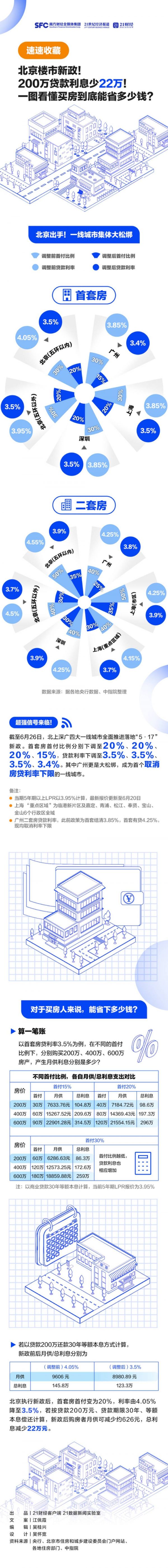 在利率方面,北京楼市新政后按首套住房商贷利率按LPR-45BP(即贷款利率为3.5%)计算,以200万商贷等额本息30年为例,总利息(较利率为4.05%)可少22万元!全国楼市新政频发,现在买房到底能省多少钱?21数据新闻实验室与你一图看懂,码住收藏!