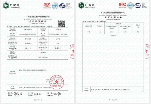 雅琪诺除醛窗帘就是这样一款经过专业认证的环保无甲醛产品,并且除醛率可达97%。雅琪诺除醛窗帘搭载耐酷时技术,其对应制备的耐酷时纳米粒子以光催化反应为原理,在催化加速甲醛分解为无害物质的同时不改变自身的化学性质,因此可以长效地促进除醛反应进行,持久守护家居环境的清洁健康。