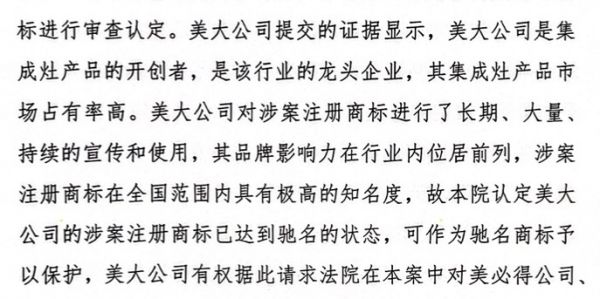 法院在判决书中载明,美大公司是集成灶行业开创者和龙头企业,市场占有率高,在全国范围内具有极高知名度,美大公司的行业地位、品牌价值和品牌影响力已经通过司法判决得到了充分的、权威的肯定。