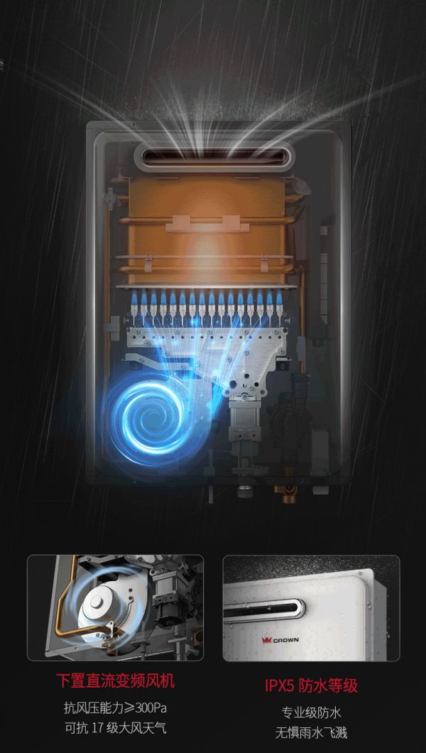 如果你家楼层高或是生活在沿海地带,强风就能直接倒灌进热水器,再强的火也很难扛得住户外的8级大风。而为了防止热水器被大风吹熄,皇冠16ES搭载强鼓直流变频风机,高达6000转/分钟鼓风强排,即使强台风天气(最高可抗17级大风)也能实现主动增压抗风,确保燃气热水器正常运转,以及保障燃烧和排气安全。