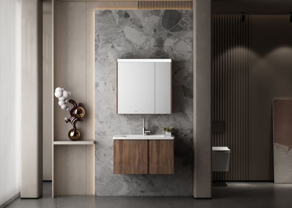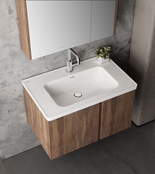 荣获质量金奖的慕森浴室柜,主打古朴简约的设计,柜体表面优美的木纹,符合现代城市消费者崇尚自然的审美趋势。陶瓷一体盆的设计更是深得评委认可。厚度仅为30mm的台面,一改传统陶瓷盆的厚重感。盆胆被进行了加深处理,增强了实用性,解决了洗涤时的溅水问题。盆边微微翘起的挡水边,有效防止水流溢出,让浴室远离淋漓湿滑。