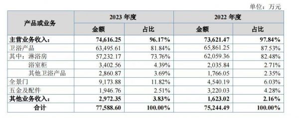 在主营业务方面,按业务类型或产品种类划分来看,在玫瑰岛的营业收入中,淋浴房占据了绝对的大头。例如2023年玫瑰岛淋浴房的收入为5.72亿元,占比73.76%,2022年则为6.21亿元,占比82.48%。