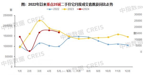 中指研究院数据显示,今年前5月,25个代表城市二手房成交套数同比下降12.9%,新房和二手房累计总成交套数同比下降26.5%,其中二手房成交占比提升至64.5%;6月份(6月3日-30日),25个代表城市二手房周均成交套数较5月周均增长14.5%,较上年同期增长24.1%。