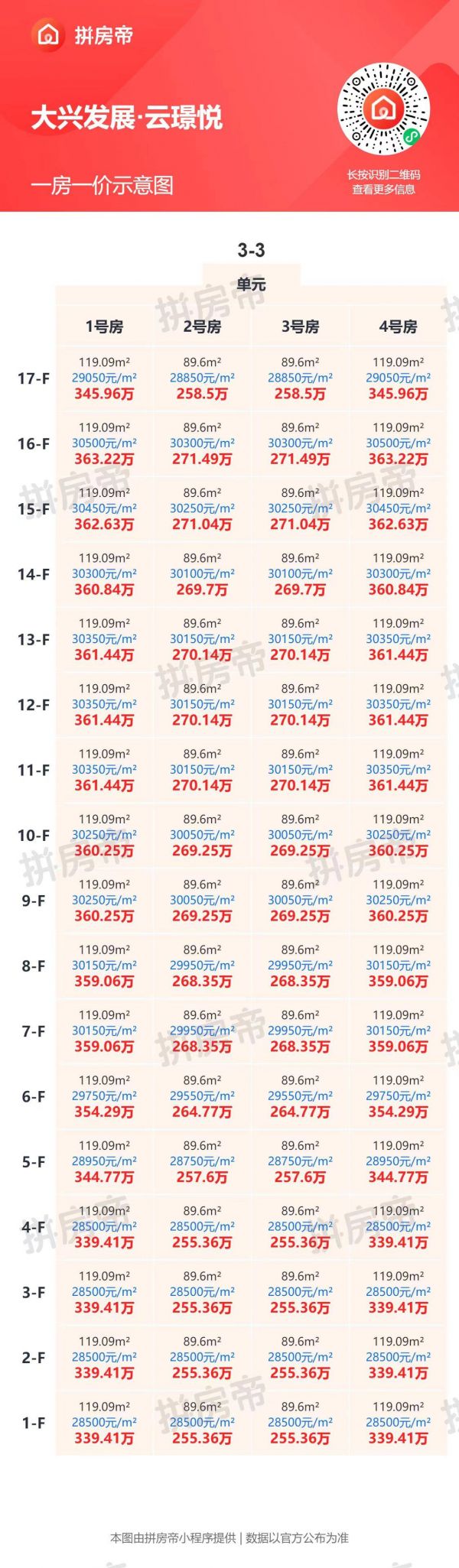 云璟悦本次配售套数共790套,其中,两居室10套,建筑面积约67-69平方米;三居室683套,建筑面积约89-119平方米;四居室97套,建筑面积约118-119平方米。房屋销售均价为30000元/平方米(根据具体楼层、朝向在±5%的范围内调整销售价格),全装修交房。