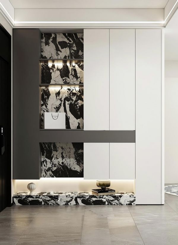 色彩与材质:整个客厅的色彩搭配协调而富有层次感,黑色、白色、灰色以及大理石的纹理等元素的运用使得空间既现代又不失温馨。材质上,从电视柜的坚固木质到壁炉的大理石纹理再到沙发的柔软织物,都体现了高品质的生活追求。