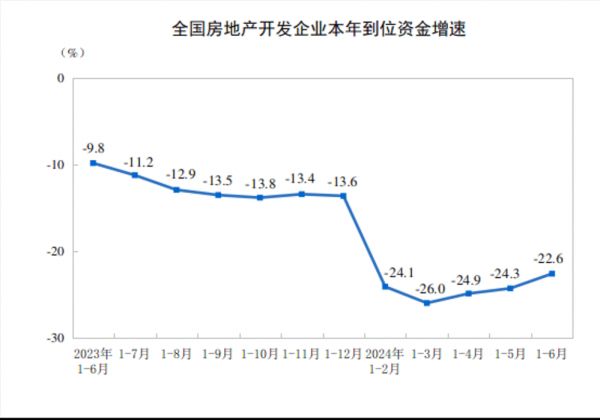 1—6月份,房地产开发企业到位资金53538亿元,同比下降22.6%。其中,国内贷款8207亿元,下降6.6%;利用外资13亿元,下降51.7%;自筹资金18862亿元,下降9.1%;定金及预收款15999亿元,下降34.1%;个人按揭贷款7749亿元,下降37.7%。