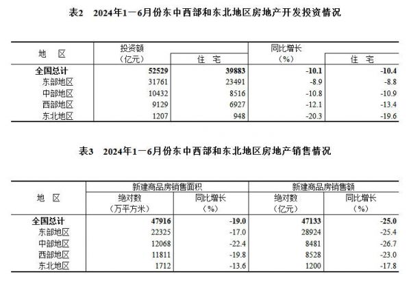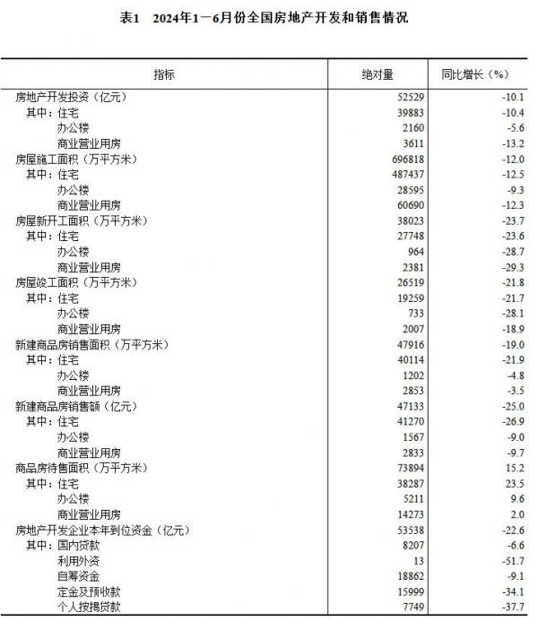 1—6月份,房地产开发企业房屋施工面积696818万平方米,同比下降12.0%。其中,住宅施工面积487437万平方米,下降12.5%。房屋新开工面积38023万平方米,下降23.7%。其中,住宅新开工面积27748万平方米,下降23.6%。房屋竣工面积26519万平方米,下降21.8%。其中,住宅竣工面积19259万平方米,下降21.7%。