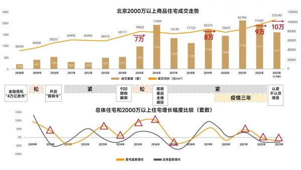 以北京为例,从2008年至今,2000万以上豪宅的增长幅度大部分时间都是超越大盘总体水平。