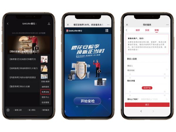 在“SAKURA樱花”微信公众号中还专门设置了“安检门诊部”,用户通过参与线上“云安检”,就可获取家电体检报告,若出现红码或黄码,就可及时预约樱花服务人员上门安检,进一步排查安全隐患。