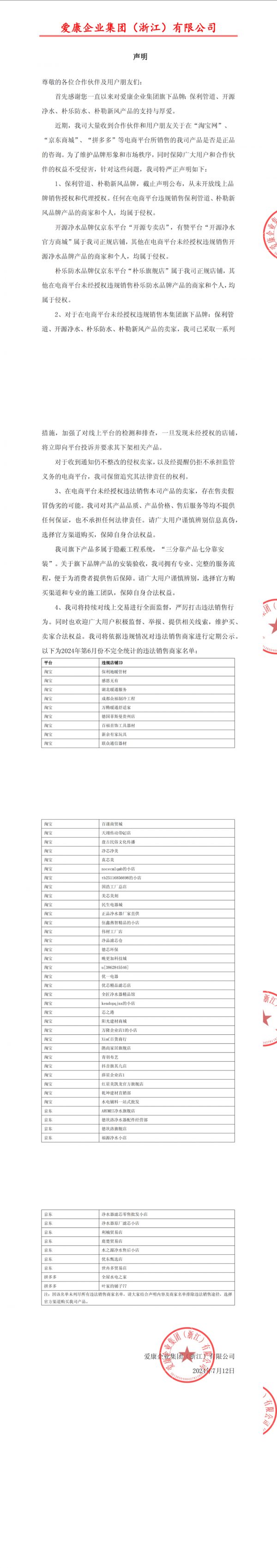 爱康企业集团公示电商平台违法销售品牌产品店铺名单