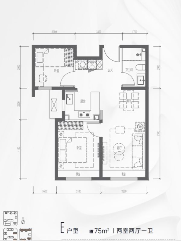 来看看75平两居,比较常见的南向两居,客厅和主卧带飘窗,厨房为U型设计,存储和收纳空间更大,可以满足两个人同时做饭的需求,餐厅紧挨着厨房,动线合理;卫生间干湿分离,暗卫。