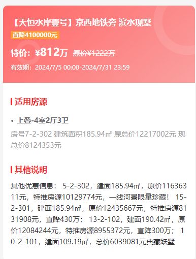 15-2-301,建面185.94㎡,原价12435667元,特推房源8131908元,直降430万;
