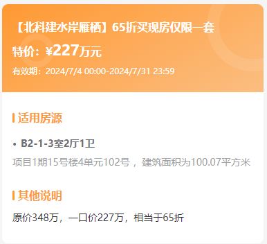 项目1期15号楼4单元102号 ,建筑面积为100.07平方米,原价348万,一口价227万,相当于65折,先到先得。