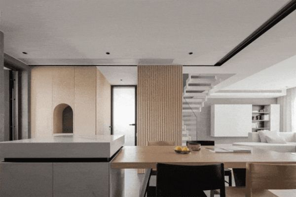 餐厅空间,原木系统柜与格栅门的完美融合,不仅成为了视觉的焦点,更将空间规整得恰到好处。在简单与自由之间,找到了完美的平衡点。而楼梯的设计,则是打破常规的点睛之笔,阶梯半通透的设计,让视觉得到极大的舒展,轻盈通透,瞬间打破了空间的沉闷与压抑。