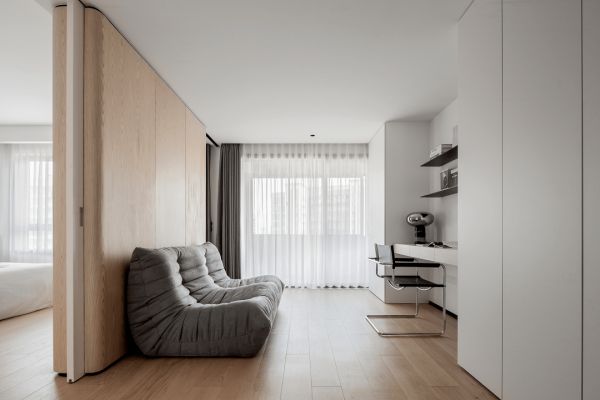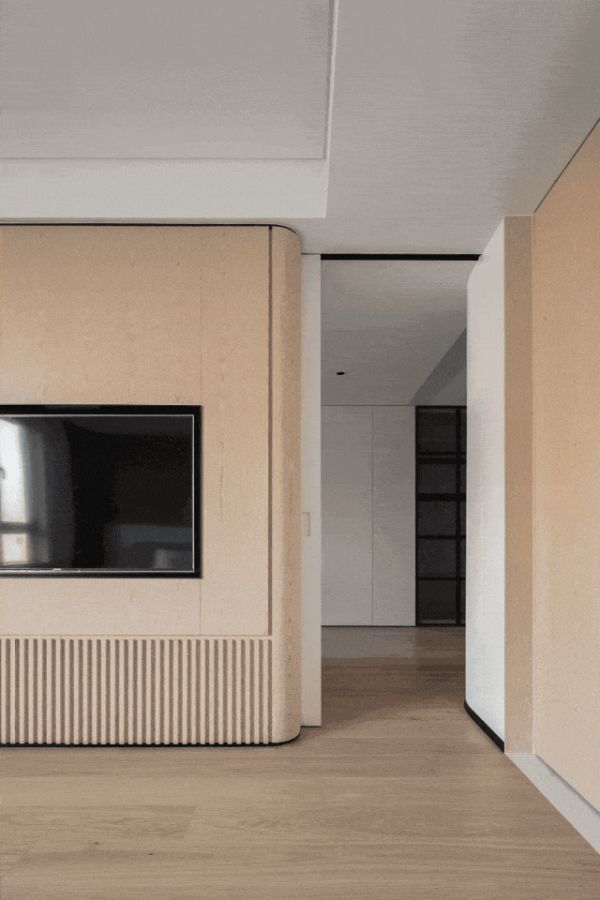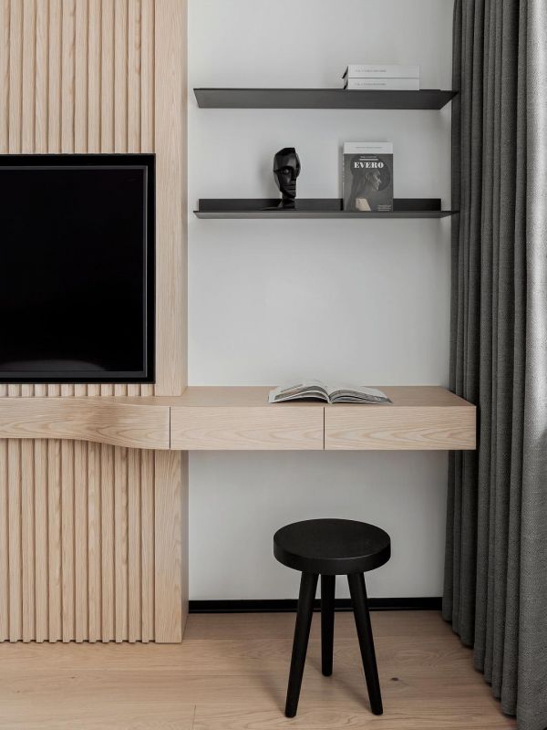 主卧空间,蓝天豚以干净清爽的白木配色为主调,搭配简约白板与格栅背景,流露出一种沉静隽永的美感。大面积的木饰面上墙,让空间更显内敛与大气。电视嵌入式设计,既节省了空间,又增添了美观性。两侧隐形门的设计,更是巧妙地将衣帽间与书房隐藏其中,让生活更显整洁与精致。