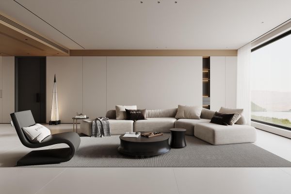 单人扶手椅:在沙发对面,放置着一把黑色的单人扶手椅,椅子上搭配了一个白色的抱枕,形成鲜明对比,同时也为整个空间增添了一抹柔和的色彩。