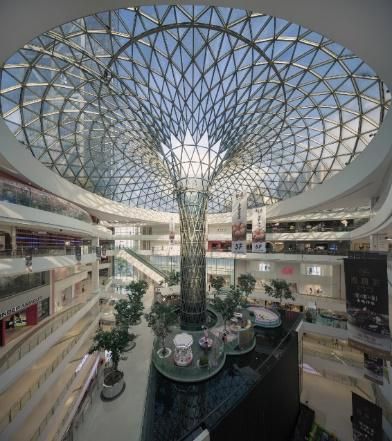 八层高的商业广场是一个外向的空间,三条商业长廊将内部的商业空间与周围的街道连接起来,并在建筑中心形成了一个三角形的巨大中庭。参照大型温室花园的手法,设计以一根中心柱支撑起巨大的环形穹顶天窗,在商场三层打造出一处室内花园。天窗自穹顶向外辐射,延伸至三条商业长廊上方,使建筑从顶层至地下二层都能享受到充足的日光。