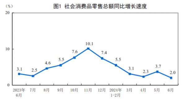 7月15日,国家统计局发布6月份社会消费品零售总额主要数据。1-6月,社会消费品零售总额235969亿元,同比增长3.7%;6月份,社会消费品零售总额40732亿元,同比增长2.0%。