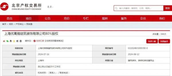 7月16日,据北京产权交易所,国有控股企业优高雅有限公司拟挂牌转让北京优高雅装饰工程有限公司、上海优高雅建筑装饰有限公司各80%股权。截至2024年5月31日,北京优高雅装饰工程有限公司营业收入13640.62万元,净利润2530.44万元;上海优高雅建筑装饰有限公司营业收入8279.92万元,净利润139.57万元。