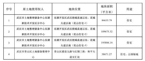其中,东湖开发区武汉绕城高速以东、花城大道以南(花山住宅-1)地块面积84635.79平方米;东湖开发区武汉绕城高速以东、花城大道以南(花山住宅-2)地块面积109675.32平方米;东湖开发区武汉绕城高速以东、花城大道以南(花山住宅-3)地块面积195806.14平方米;青山区建设九路与红钢三街、和平大道交汇处地块38671.27平方米。