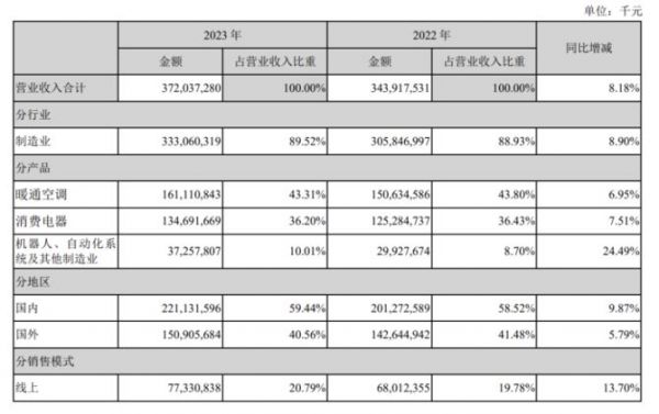 2023年公司年度报告显示,美的集团实现营业收入3720.37亿元,其中国外营业收入1509.06亿元,占比40.56%,较2022年的1426.4亿元同比增长5.79%。