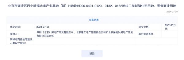 7月25日,北京海淀区西北旺镇一宗涉宅用地正式出让,根据成交结果,该地块由保利及北京建工联合体以总价89.01亿元竞得,溢价率3.5%。