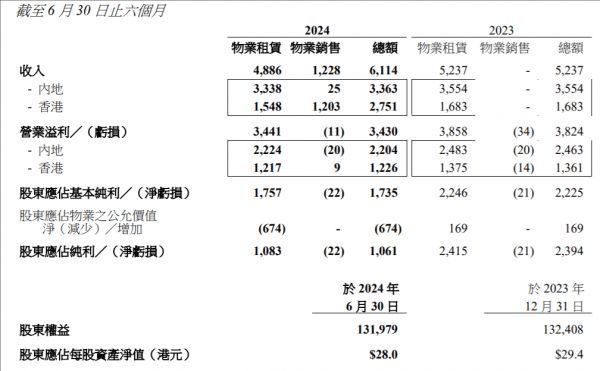 中报显示,恒隆地产上半年录得净利润约为10.61亿港元,同比下跌约55.72%;股东应占纯利润为17.35亿港元,同比下跌22%。