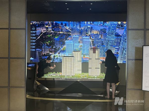 7月29日下午5时许,在黄浦区融创外滩壹号院营销中心,销售人员陪同两位购房者在沙盘前介绍细节,另有一组购房者乘车去参观实体样板间。