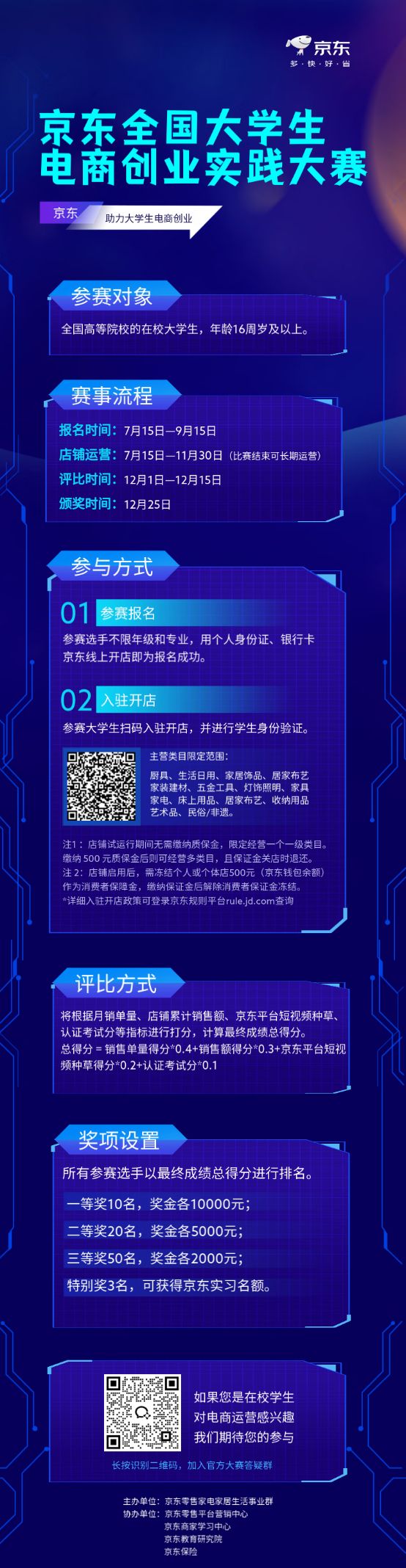 本次大赛面向年龄16周岁以上的全国高等院校在校大学生,不限年级和专业。大赛将从7月持续到12月,分为注册开店、店铺实践运营、决赛评比等阶段。根据赛事规划,参赛学生经营类目主要为厨具、生活日用、家居饰品、家装建材、五金工具、灯饰照明、家具、家用电器、床上用品、居家布艺、收纳用品、艺术品、民俗/非遗等品类,店铺试运行期间无需缴纳质保金就能经营一个类目。大赛评比将依据月销售单量、店铺累计GMV、站内短视频种草推广、认证考试分等指标进行综合打分,排名前70名的参赛者将有机会获得至高10000元奖金及京东实习机会。