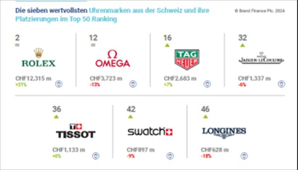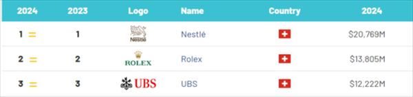 与2023年相同,品牌金融将制表大亨劳力士(Rolex)评为瑞士第二大最具价值品牌。据估计,其品牌价值已升至123亿瑞郎(约合人民币1000亿元)。增长的主要驱力来自更高的销售预期。瑞银集团(UBS)以109亿瑞郎(约合人民币886亿元)的品牌价值位居第三。